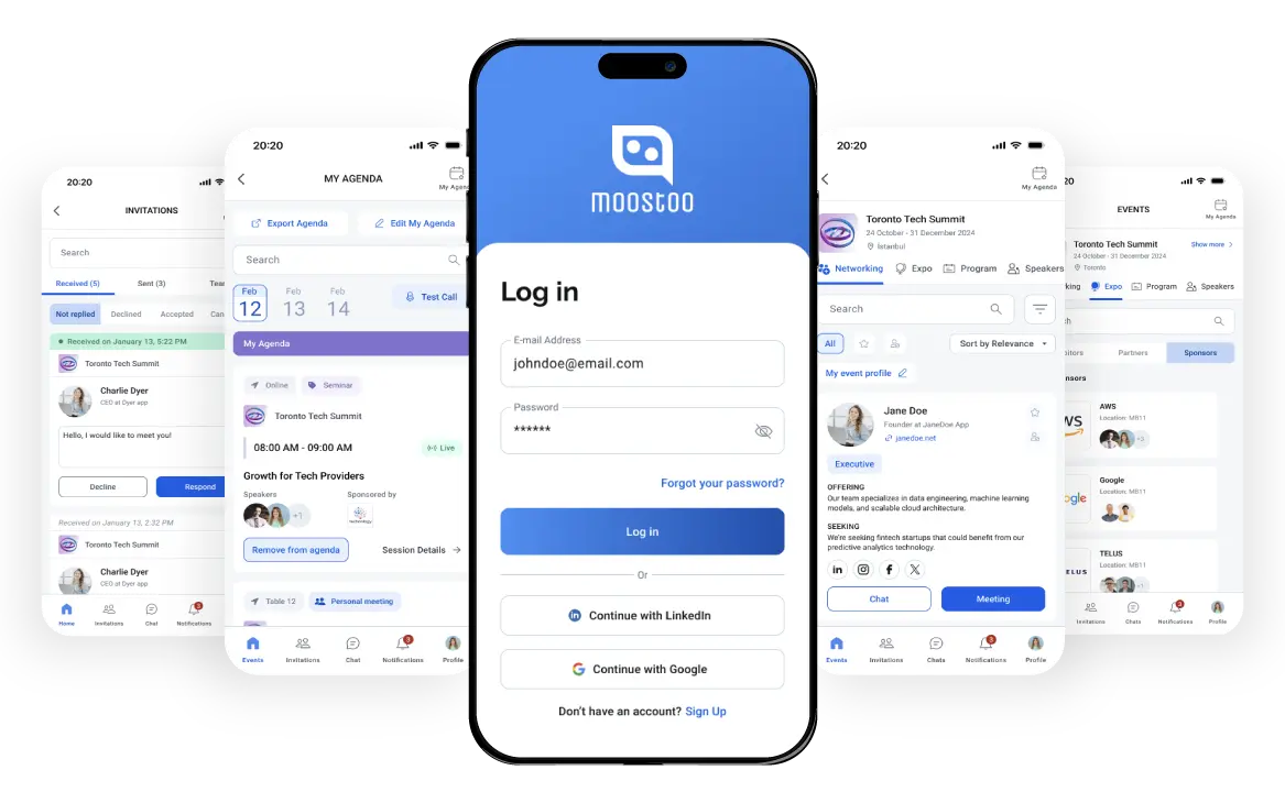 Manage Your Events on the Go! Download the Moostoo mobile app to manage your schedules, customize agendas, and access real-time event updates — all from your phone. Whether you’re an attendee, speaker, or sponsor, everything available on the web is accessible in the app. Moostoo works seamlessly on both iOS and Android, making event engagement easy and portable.